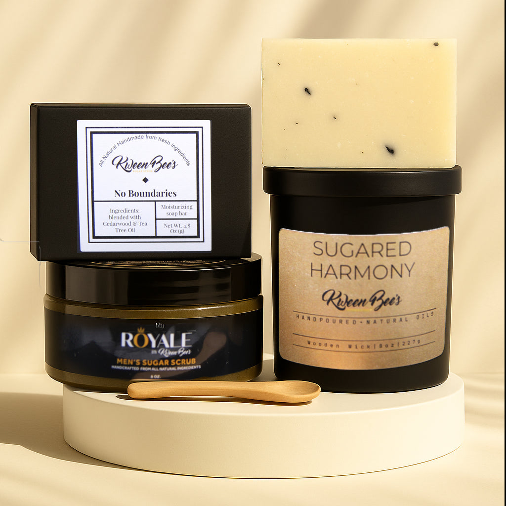 Kings, meet our new self-care bundle for men! Indulge in a pampering journey with Royale, our luxurious hand-crafted sugar scrub for men. Loaded with pure essential oils and sensational fresh ingredients the bundle includes: